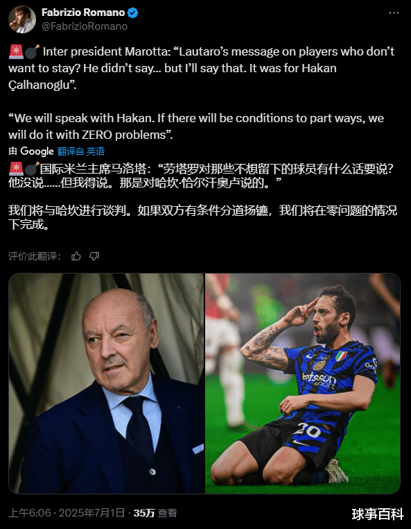 今天的比赛,恰尔汗奥卢因伤没有进入球队阵容。在劳塔罗赛后发飙之后,意大利媒体普遍将矛头对准了恰尔汗奥卢,也有媒体认为他说的人是小图拉姆。赛后国米主席马洛塔在采访中直接点明,劳塔罗说的是近期转会绯闻缠身的恰尔汗奥卢。